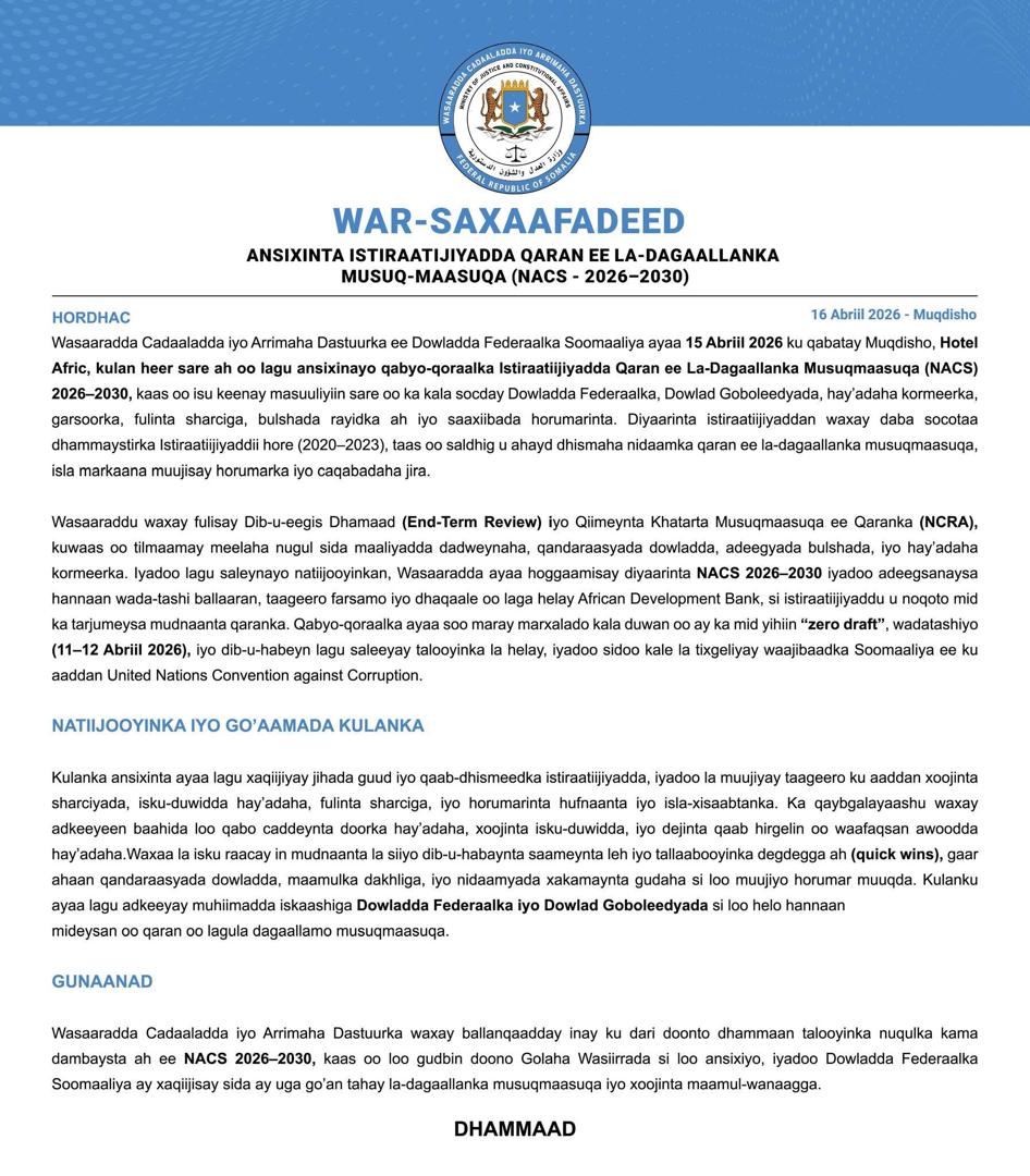 Wasaaradda Caddaaladda iyo Arrimaha Dastuurka XFS ayaa maaanta soo saartay warsaxaafadeed ku saabsan ansixinta Istiraatiijiyadda Qaran ee La-dagaallanka musuqmaasuqa.