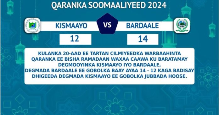 Tartankaan bisha Ramadaan ee ay qabatay Warbaahinta Qaranka ayaa xalay ku soo idlaaday 14- dhibcood.oo ay guushii ku raacday Degmada Bardaale,halka kooxdii ku tartameysay magaca Degmada Kismaayo ay keensadeen 12-dhibcood.