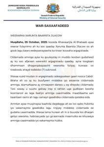Weerarka argagixiso ee galabta dhacay wuxuu ka tarjumayaa rafashada cadawga argagixisada ah ee shalay, 03-da Oktoobar 2025, jab xooggan loogu geystay gobolka Shabeellaha Hoose, halkaas oo laga xoreeyay deegaannada Awdheegle, Raqayle, Shaangarre iyo Malabo.