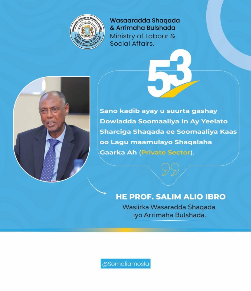Ugu dambayn Wasiirka ayaa xusay in Xeerka Shaqada (Lr.36, 2024) uu yahay tallaabo taariikhi ah oo wax weyn ka beddeli doonta hab dhaqanka shaqo ee dalka, isla markaana kor u qaadi doona kalsoonida maalgashadayaasha gudaha iyo kuwa caalamiga ah.