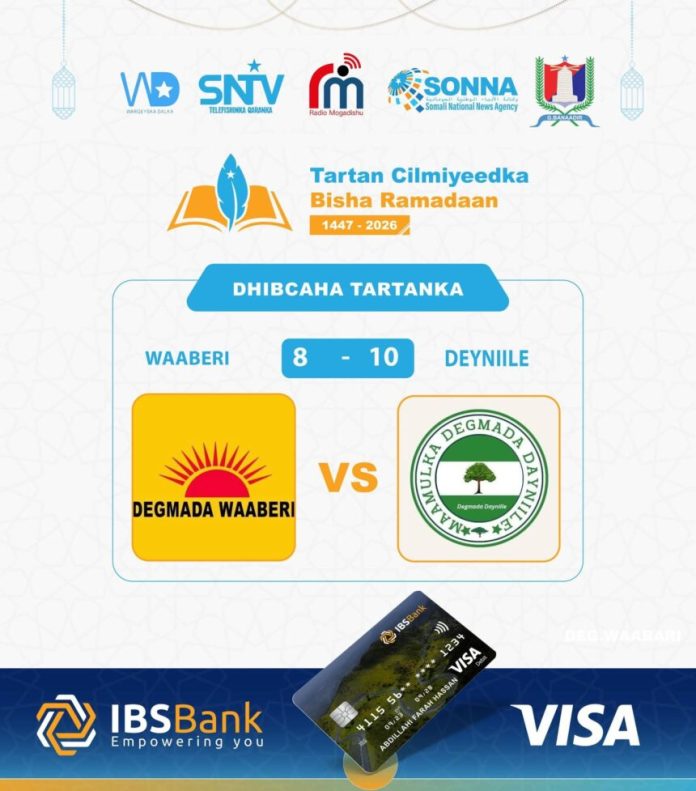 Muqdisho(Wargeyska Dalka):’Tartan cilmiyeedka bisha Ramadaan oo galay sanadkii lix iyo tobnaad, isla markaana ay qabaneyso Warbaahinta Qaranka Soomaaliyeed, ayaa si toos ah looga daawadaa Telefishinka Qaranka Soomaaliyeed, lagana dhageystaa Radio Muqdisho habeen walba,xalay waxaa tartanka ku loollamay degmooyinka Waabari iyo Deyniile oo ka wada tirsan Gobolka Banaadir. Barnaamijka waxaa si wadajir ah u taaba-gelinaya Bankiga IBS iyo Maamulka Gobolka Banaadir.