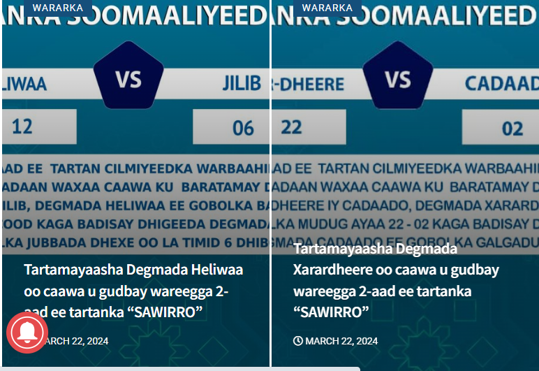 Qeybtii hore ee Tartanka bisha Ramadaan ee ay qabatay Warbaahinta Qaranka ayaa xalay ku soo idlaaday 22- dhibcood.oo ay guushii ku raacday Degmada Xaradheere ,halka kooxdii ku tartameysay magaca Degmada Cadaado ay keensadeen 2 dhibcood.