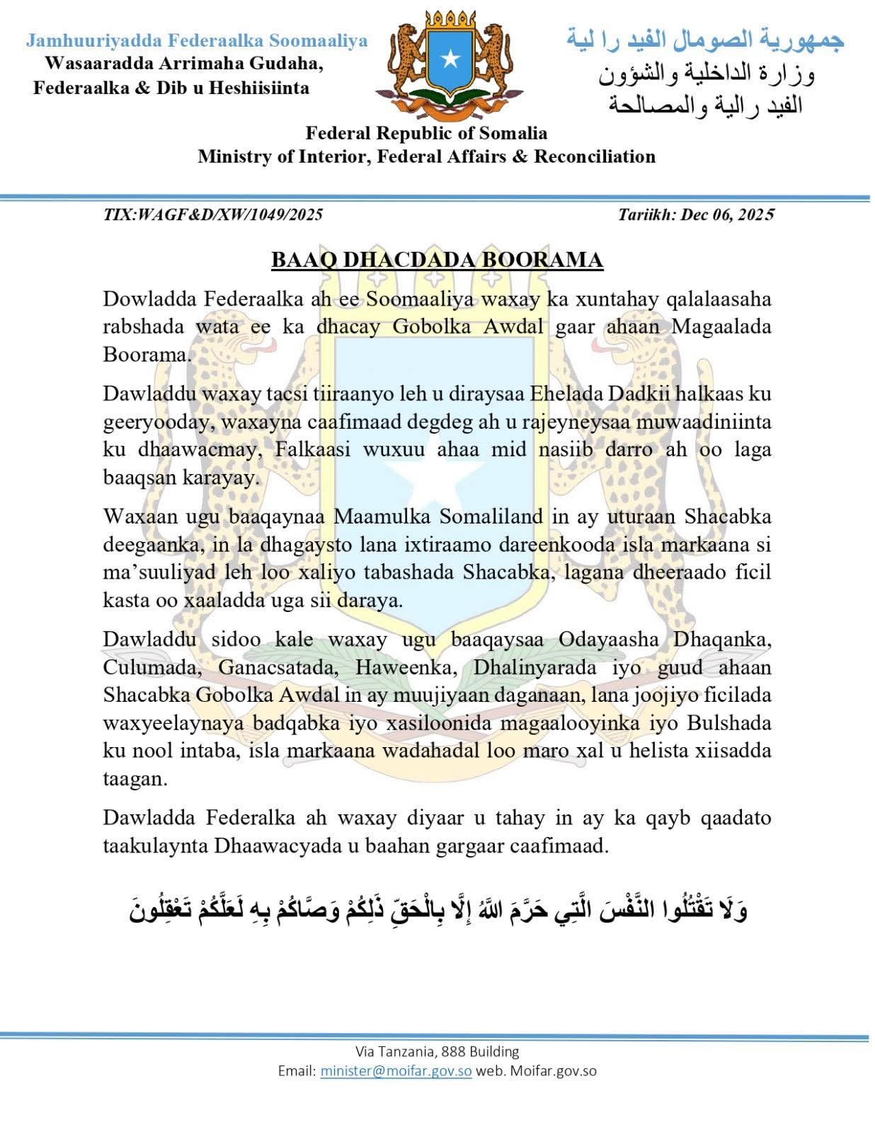 Mudisho(Wargeyska Dalka):-Dowladda Federaalka Soomaaliya oo baaq kasoo saartay qalalaasahii rabshadaha watay ee ka dhacay gobolka Awdal, gaar ahaan Magaalada Boorama.