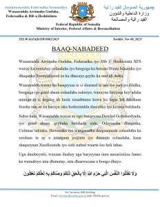 Muqdisho(Wargeyska Dalka):-Wasaaradda Arrimaha Gudaha, Federaalka iyo Dib-u-heshiisiinta XFS ayaa baaq nabadeed kasoo saartay, Dilalka iyo Beegsiga ka baxsan Diinta Islaamka iyo Dhaqanka Soomaaliyeed ee ka dhacaya qeybo ka mid ah dalka.