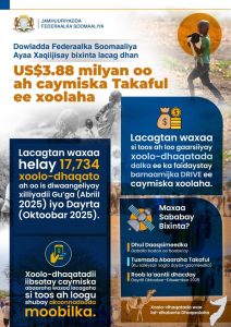 Muqdisho(Wargeyska Dalka):-Dawladda Federaalka Soomaaliya ayaa xaqiijisay bixinta lacag dhan US$3.88 milyan oo ah caymiska Takaful ee xoolaha,Lacagtan waxaa si toos ah loo gaarsiiyay xoolo dhaqatada dalka ee ka faa’iidaystay barnaamijka DRIVE ee caymiska xoolaha.