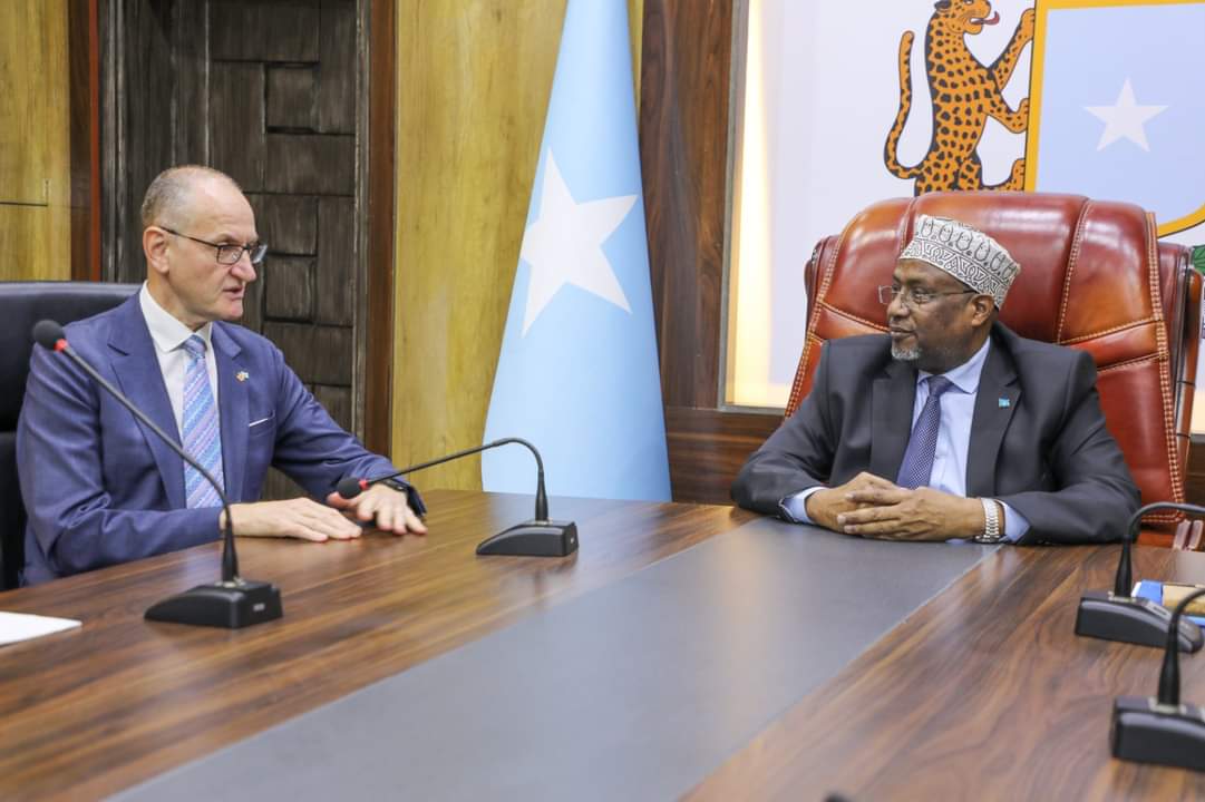 Guddoomiyaha golaha shacabka baarlamaanka Jamhuuriyadda Federaalka Soomaaliya ahan Ku-simaha madaxweynaha JFS mudane Sheekh Aadan Maxamed Nuur (Madoobe) ayaa maanta xafiiskiisa kulan kula qaatay Safiirka cusub Boqortooyada dalka Ingiriiska ee Soomaaliya Amb. Mike Nithavrianakis.
