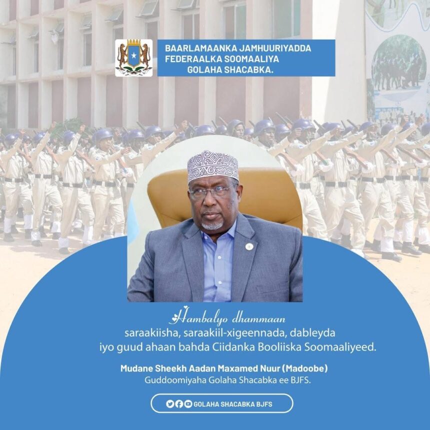 Guddoomiyaha Golaha Shacabka ee Baarlamaanka Jamhuuriyadda Federaalka Soomaaliya Mudane Sheekh Aadan Maxamed Nuur (Madoobe) ayaa munaasabadda xuska Sanad-guuradii 82-aad ee ka soo wareegtay aas-aaskii Ciidanka Booliiska Soomaaliyeed awgeed hambalyo iyo bogaadin u diray dhammaan saraakiisha, saraakiil-xigeennada, dableyda iyo guud ahaan bahda Ciidanka Booliska Soomaaliyeed.