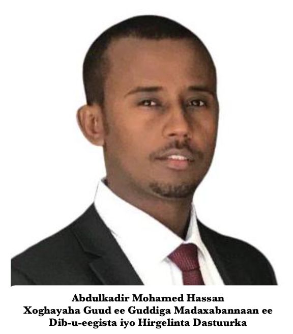 Guddoomiyaha Guddiga Madaxabannaan ee Dib-u-eegista iyo Hirgelinta Dastuurka Mudane Burhan Aadan Cumar ayaa Xoghayaha Guud ee Guddiga Madaxabannaan ee Dib-u-eegista iyo Hirgelinta Dastuurka u magacaabay Mudane Abdulkadir Mohamed Hassan “Madoobe”.