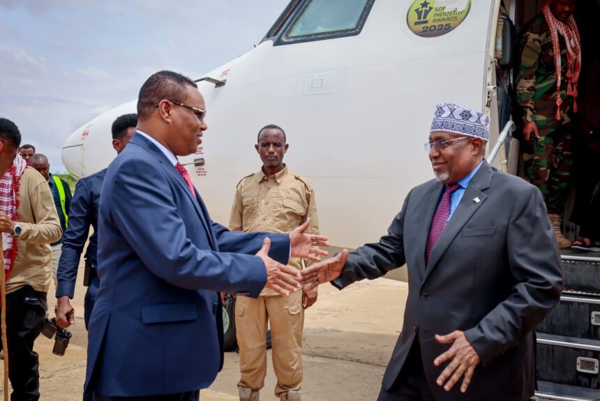 Baydhabo(Wargeyska Dalka):- Hoggaamiyaha ku-meel-gaarka ah ee Dowlad Gobleedka Koonfur Galbeed, Mudane Jibriil Cabdirashiid Xaaji, ayaa Garoonka Diyaaradaha Magaalada Baydhabo ku soo dhoweeyay Wafdi ballaaran oo uu hoggaaminayay Guddoomiyaha Golaha Shacabka Baarlamaanka Federaalka Soomaaliya, Mudane Sheekh Aadan Maxamed Nuur (Madoobe).