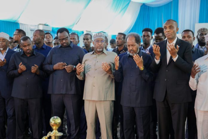 Madaxweynaha Jamhuuriyadda Federaalka Soomaaliya Mudane Xasan Sheekh Maxamuud oo ay wehelinayaan Madaxda Qaranka ayaa Garoonka Diyaaradaha Aaddan Cabdulle Cismaan si wada jir ah ugu la tukaday salaadda Jannaasada Alle ha u naxariistee Marxuumada Khadiija Maxamed Diiriye.