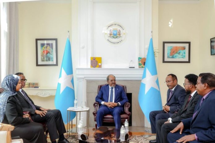 Madaxweynaha Jamhuuriyadda Federaalka Soomaaliya Mudane Xasan Sheekh Maxamuud oo safar shaqo ku jooga dalka Mareykanka ayaa booqday Xarunta Safaaradda Soomaaliya ee dalkaasi.