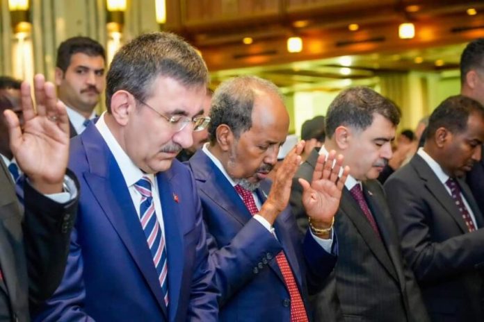 Ankara;- Madaxweynaha Jamhuuriyadda Federaalka Soomaaliya Mudane Xasan Sheekh Maxamuud oo safar shaqo ku jooga dalka Turkiga ayaa salaadda Ciidda Carafo kula tukaday Masjid ku yaala magaalada Ankara Madaxweyne ku xigeenka dalkaasi mudane Cevdet Yılmaz iyo qaar ka mid ah bulshada muslimiinta ah ee ku nool dalka Turkiga.