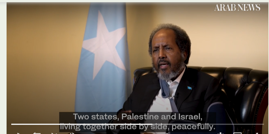 Madaxweynaha jamhuuriyadda Federaalka Somaaliya Mudane Xasan Sheekh Maxamuud oo la hadlay shabakadda Arab News inta uu joogay Boqortooyada Sacuudi Carabiya ayaa sheegay in dagaalka u dhexeeya Israa’iil iyo kooxda Falastiiniyiinta ee Xamaas lagu dhameyn karo heshiis siyaasadeed oo ah qaabka xalka laba waddan.