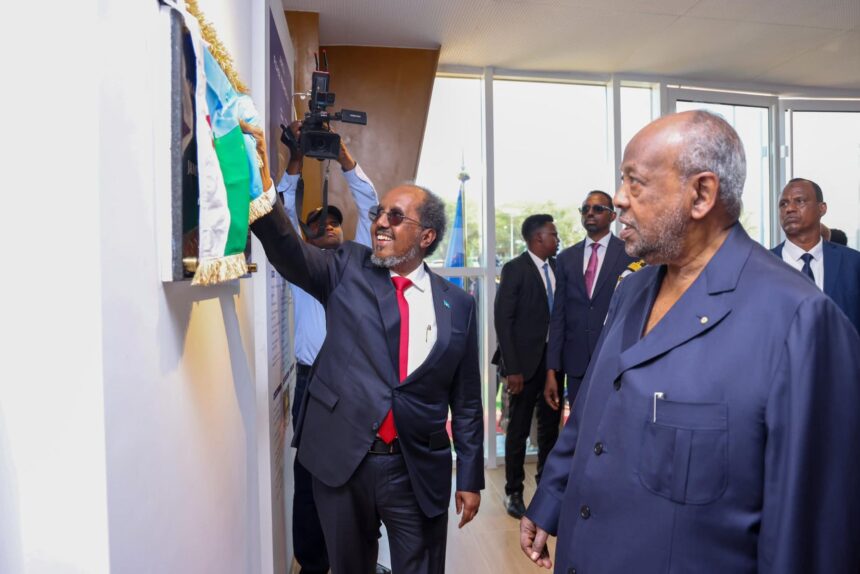 Jabuuti:-Madaxweynaha Jamhuuriyadda Federaalka Soomaaliya Mudane Xasan Sheekh Maxamuud iyo Madaxweynaha Jamhuuriyadda aan walaalaha nahay ee Jabuuti Mudane Ismaaciil Cumar Geelle ayaa maanta si wadajir ah uga qeyb galay munaasabadda Xuska 25-guurada Shirweynihii Nabadaynta Soomaaliyeed ee Carta oo horseeday dib u dhiska dowladdnimada dalkeenna.
