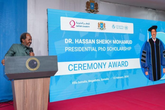 Madaxweynaha Jahmuuriyadda Federaalka Soomaaliya mudane Xasan Sheekh Maxamuud oo xarunta Madaxtooyada Qaranka kula hadlay 40 Arday oo helay deeq waxbarasho oo oo heer PhD ah ayaa kula dardaarmay in ay si hufan uga faa’iideystaan fursaddaan si ayuu yiri ay  bilow wanaagsan ugu noqdaan Jiilasha dambe ee doonaya in ay faa’iideystaan soo saarista kheyraadka ka buuxa Baddeenna.