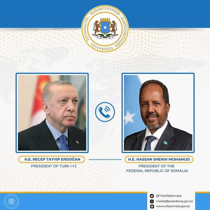 Madaxweynaha Jamhuuriyadda Federaalka Soomaaliya Mudane Dr Xasan Sheekh Maxamuud oo khadka taleefoonka kula hadlay Madaxweynaha Jamhuuriyadda Turkiga Mudane Rajab Dayib Erdogan ayaa ugu hambalyeeyey guushii taariikhiga ah ee uu ka gaaray doorashadii ka qabsoomtay dalka Turkiga.