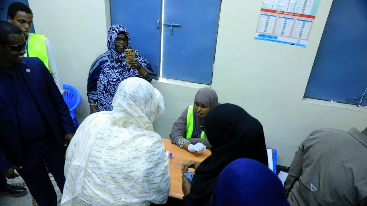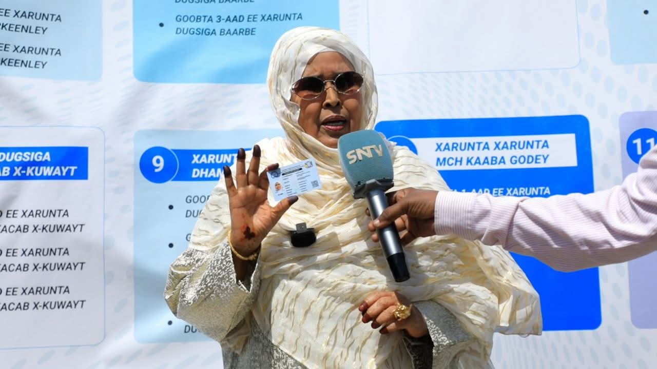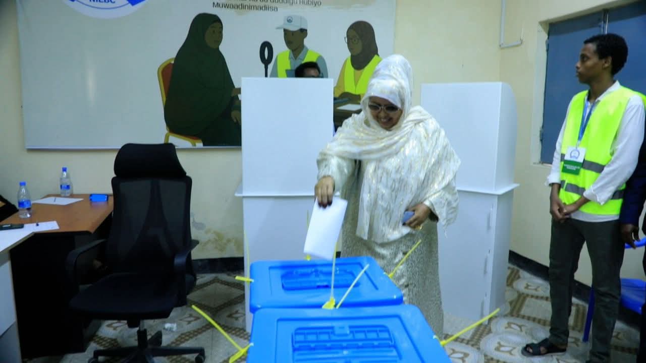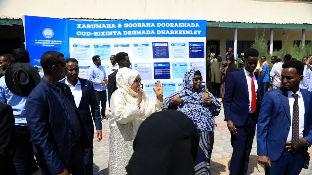 Marwada Madaxweynaha Jamhuuriyadda Federaalka Soomaaliya, Marwo Sahro Cumar Xasan ayaa maanta codkeedq ka dhiibatay Seejada Xarunta degmada Dharkiinleey ee Gobolka Benaadir oo ka mid ah goobaha loo asteeyay, cod bixinta dadweynaha iska diiwaan galiyay degmadaasi.