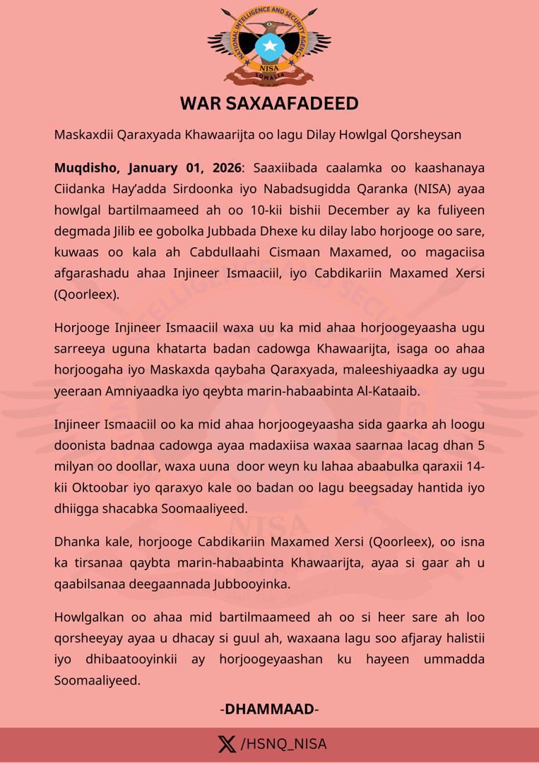 Saaxiibada caalamka oo kaashanaya Ciidanka Hay’adda Sirdoonka iyo Nabadsugidda Qaranka (NISA) ayaa howlgal bartilmaameed ah oo 10-kii bishii December ay ka fuliyeen degmada Jilib ee gobolka Jubbada Dhexe ku dilay labo horjooge oo sare, kuwaas oo kala ah Cabdullaahi Cismaan Maxamed, oo magaciisa afgarashadu ahaa Injineer Ismaaciil, iyo Cabdikariin Maxamed Xersi (Qoorleex).