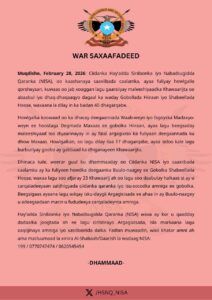 Hay’adda Sirdoonka iyo Nabadsugidda Qaranka (NISA) waxa ay kor u qaadday dadaalka joogtada ah ee lagu ciribtirayo Argagixisada, isla markaana lagu xaqiijinayo amniga iyo xasilloonida dalka. Fadlan muwaadin, wixii khatar amni ah ama macluumaad la xiriira Al-Shabaab/Daacish la wadaag NISA: