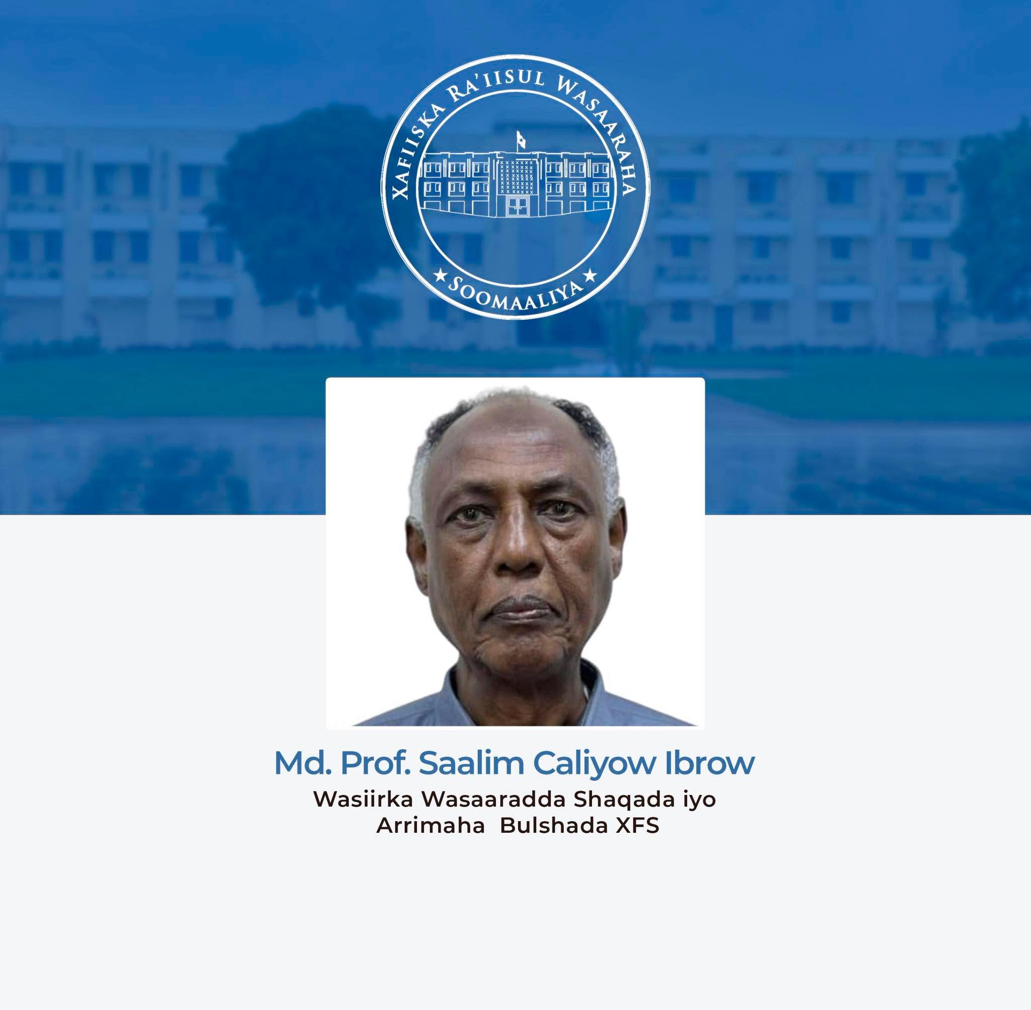 Ra’iisul Wasaaraha, ayaa markii uu arkay howsha baaxadda leh iyo shaqada hortaalla Wasaaradda Shaqada iyo Arrimaha Bulshada ee Xukuumadda Jamhuuriyadda Federaalka Soomaaliya, waxa uu u magacaabay Mudane Prof. Saalim Caliyow Ibrow, Wasiirka Wasaaradda Shaqada iyo Arrimaha Bulshada ee Xukuumadda JFS.