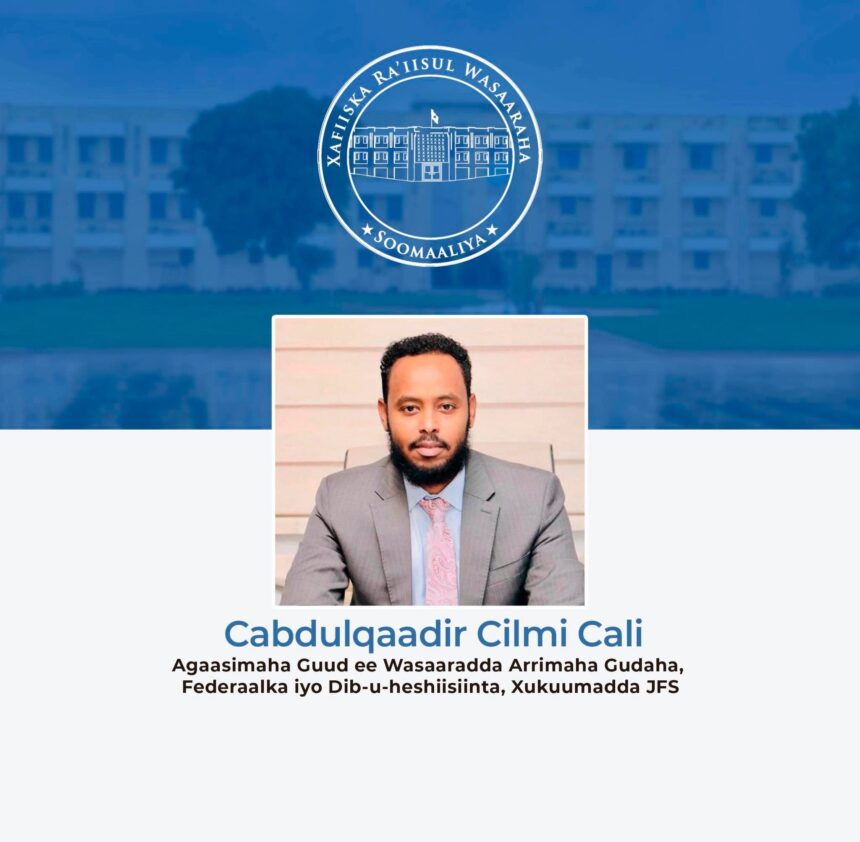 Ra’iisul Wasaaraha Xukuumadda Jamhuuriyadda Federaalka Soomaaliya mudane Xamsa Cabdi Barre ayaa Agaasimaha Guud ee Wasaaradda Arrimaha Gudaha, Federaalka iyo Dib-u-heshiisiinta u magacaabay mudane Cabdulqaadir Cilmi Cali.