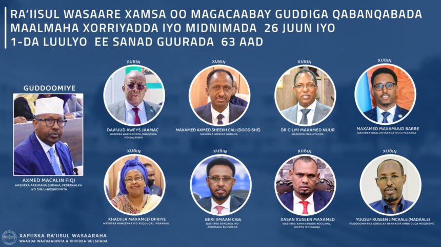 Ra’iisul Wasaaraha Xukuumadda Jamhuuriyadda Federaalka Soomaaliya, Mudane Xamsa Cabdi Barre oo garowsan qiimaha iyo mudnaanta ay leedahay sanad guurada 63—aad ee Gobannimada, Midnimada iyo dhalashadii Jamhuuriyadda Soomaaliya ayaa waxa uu magacaabay Guddiga qaban-qaabada Xuska Sanad guurada 63-aad ee maalmaha xorriyadda oo ka kooban siddeed Wasiir iyo Guddoomiyaha Gobolka Banaadir.