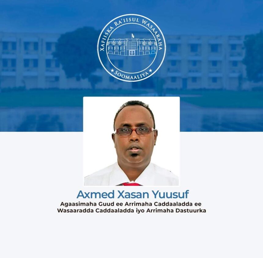 Muqdisho(Wargeyska Dalka):-Ra’iisul Wasaaraha Xukuumadda Jamhuuriyadda Federaalka Soomaaliya, Mudane Xamsa Cabdi Barre, ayaa Agaasimaha Guud ee Arrimaha Caddaaladda ee Wasaaradda Caddaaladda iyo Arrimaha Dastuurka u magacaabay Mudane Axmed Xasan Yuusuf.
