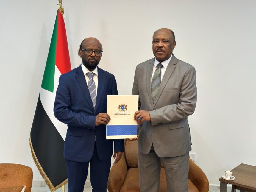 Safiirka Jamhuuriyadda Federaalka Soomaaliya u fadhiya Dalka Suudaan Mudane Axmed Jaamac Cumar, ayaa u gudbiyay waraaqaha aqoonsigiisa (Letters of Credence) Wasiirka Arrimaha Dibadda iyo Iskaashiga Caalamiga ah ee Suudaan, Mudane Muxiyadiin Saalim, taasoo qeyb ka ah habraaca rasmiga ah ee aqoonsiga diblomaasiyadeed.