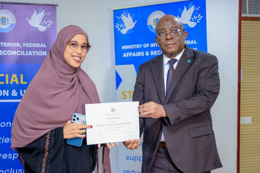 Wasiirka Wasaaradda Warfaafinta, Dhaqanka iyo Dalxiiska, Mudane Daa’uud Aweys Jaamac iyo Wasiir ku-xigeenka Wasaaradda Arrimaha Gudaha, Federaalka iyo Dib-u-heshiisiinta mudane Cabdixakiim Ashkir ayaa gudoonsiiyey shahaadooyinkii ka qaybgalayaasha ee Aqoon-kororsiga Warbaahinta Nabadda: Tayeynta Xaqiijinta Xogta, Xirfadaha Sheeko-sameynta iyo Xiriirka Isku-haynta Bulshada.