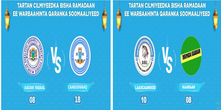 Qeybtii hore ee Tartanka bisha Ramadaan ee ay qabatay Warbaahinta Qaranka ayaa xalay ku soo idlaaday 10- dhibcood.oo ay guushii ku raacday Degmada Laascaanood ,halka kooxdii ku tartameysay magaca Degmada Kaaraan ay keensadeen 8 dhibcood.