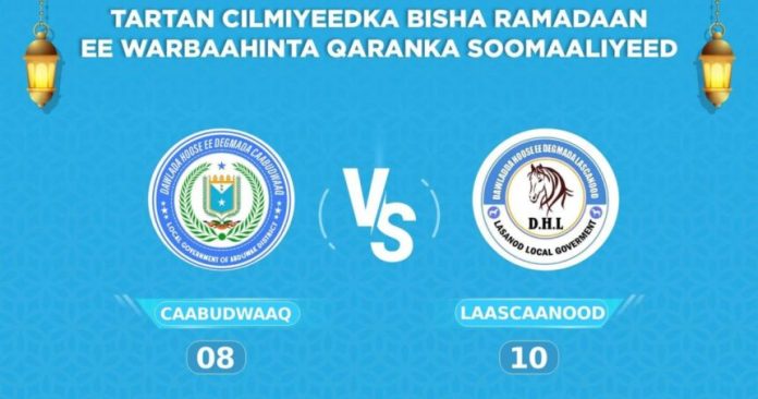 Tartankaan bisha Ramadaan ee ay qabatay Warbaahinta Qaranka ayaa xalay ku soo idlaaday 10- dhibcood.oo ay guushii ku raacday Degmada Laascaanood,halka kooxdii ku tartameysay magaca Degmada Caabudwaaq ay keensadeen 8-dhibcood.