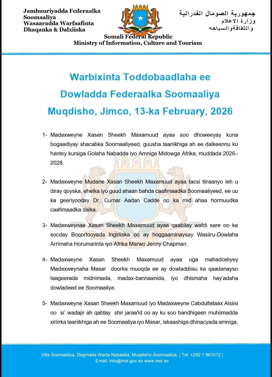 Dowladda Federaalka Soomaaliya Muqdisho, Jimco, 13-ka February, 2026