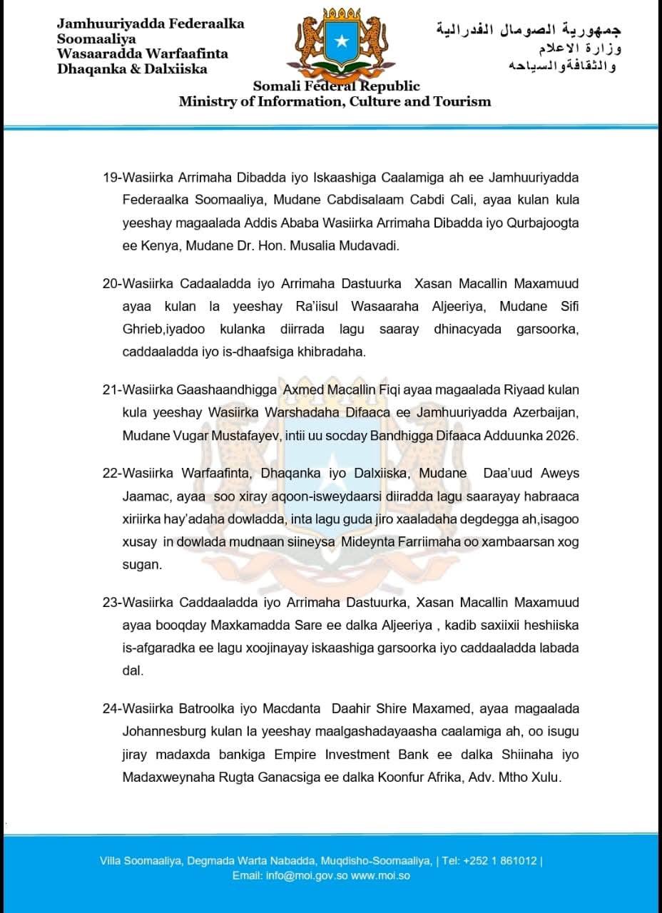16- Jamhuuriyadda Federaalka Soomaaliya ayaa mar kale xaqiijisay miisaankeeda diblomaasiyadeed ee caalaamka, kadib markii loo doortay inay xubin ka noqoto Golaha Nabadda iyo Ammaanka ee Midowga muddada u dhaxeysa 2026 ilaa 2028.