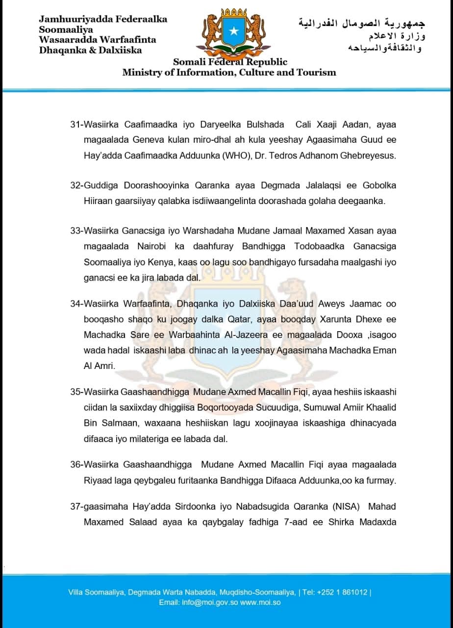 34- Wasiirka Warfaafinta, Dhaqanka iyo Dalxiiska Daa’uud Aweys Jaamac oo booqasho shaqo ku joogay dalka Qatar, ayaa booqday Xarunta Dhexe ee Machadka Sare ee Warbaahinta Al-Jazeera ee magaalada Dooxa ,isagoo wada hadal iskaashi laba dhinac ah la yeeshay Agaasimaha Machadka Eman Al Amri.