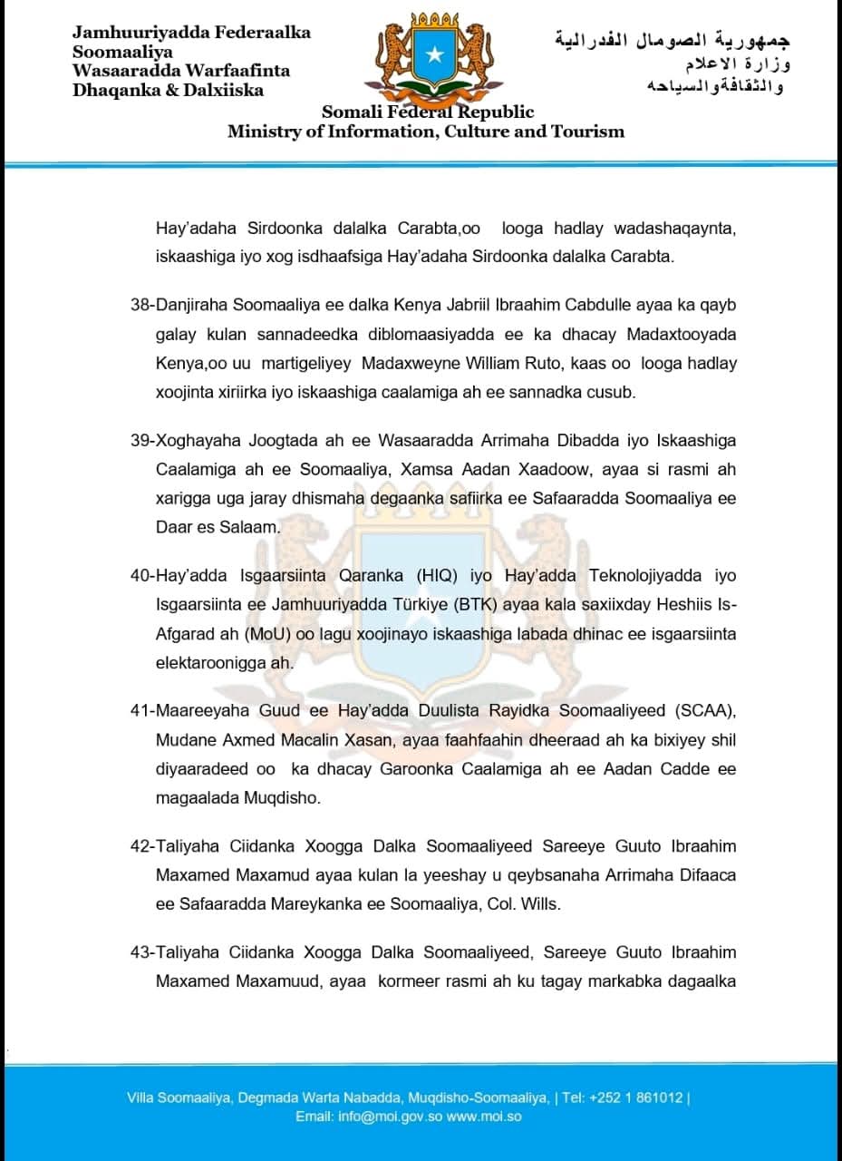 22- Wasiirka Warfaafinta, Dhaqanka iyo Dalxiiska, Mudane Daa’uud Aweys Jaamac, ayaa soo xiray aqoon-isweydaarsi diiradda lagu saarayay habraaca xiriirka hay’adaha dowladda, inta lagu guda jiro xaaladaha degdegga ah,isagoo xusay in dowlada mudnaan siineysa Mideynta Farriimaha oo xambaarsan xog sugan.