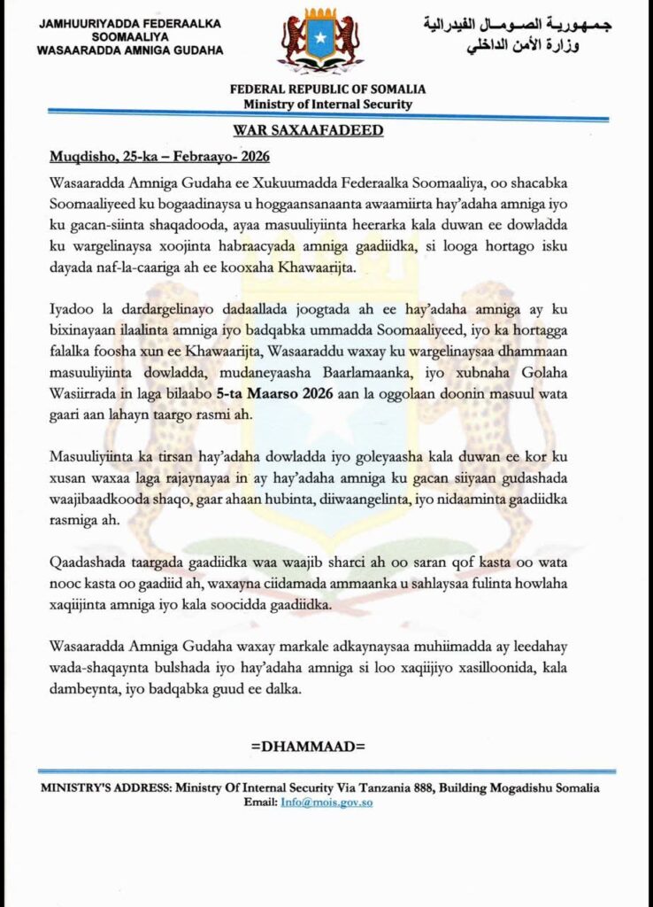 Wasaaradda amniga gudaha ee Xukuumadda Federaalka Soomaaliya oo shacabka Soomaaliyeed ku bogaadisay u hoggaansanaanta awaamiirta hay’adaha amniga iyo ku gacan-siinta shaqadooda, ayaa dhanka kale masuuliyiinta heerarka kala duwan ee dowladda ku wargelinaysa xoojinta habraacyada amniga gaadiidka, si looga hortago isku dayada naf-la-caariga ah ee kooxaha Khawaarijta.