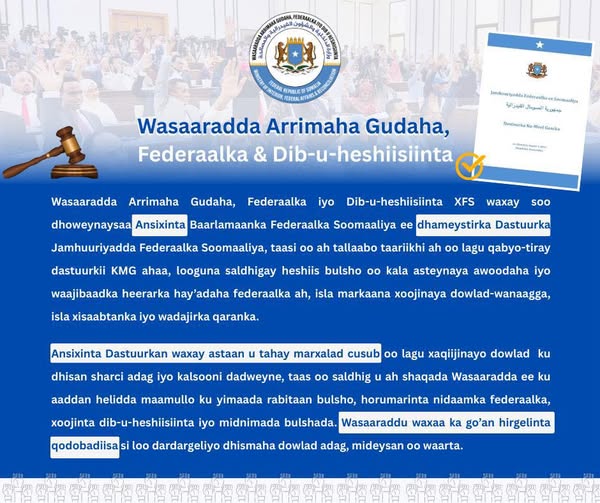 Wasaaradda ayaa ansixinta dastuurka ku tilmaantay tallaabo taariikhi ah oo lagu qabyo-tiray dastuurkii KMG ahaa, looguna saldhigay heshiis bulsho oo kala asteynaya awoodaha iyo waajibaadka heerarka hay’adaha federaalka ah, isla markaana xoojinaya dowlad-wanaagga, isla xisaabtanka iyo wadajirka qaranka.
