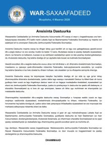Muqdisho(Wargeyska Dalka):-Wasaaradda Caddaaladda iyo Arrimaha Dastuurka ayaa si weyn u soo dhaweysay ansixinta rasmiga ah ee Dastuurka dalka, kaddib markii Labada Aqal ee Baarlamaanka Federaalka Soomaaliya ay cod aqlabiyad ah maanta ku meel mariyeen Dastuurka Jamhuuriyadda Federaalka Soomaaliya.