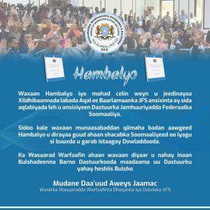 Wasaaradda Warfaafinta Dhaqanka iyo Dalxiiska ee XFS ayaa soo dhoweynaysaa ansixinta Baarlamaanka Federaalka Soomaaliya ee loo qaaday dhameystirka Dastuurka Jamhuuriyadda Federaalka Soomaaliya.