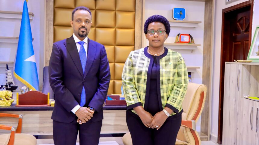 Muqdisho-(Wargeyska Dalka)-Ku-simaha Wasiirka, ahna Wasiir Ku-xigeenka Wasaaradda Warfaafinta, Dhaqanka iyo Dalxiiska ee Xukuumadda Federaalka Soomaaliya, Mudane Cabdiraxmaan Yuusuf Al-Cadaala, ayaa maanta xafiiskiisa ku qaabilay Xoghayaha Fulinta ee Guddiga Af-Sawaaxiliga ee Urur Gobaleedka Iskaashiga Dhaqaalaha ee Bariga Afrika, Dr. Caroline Asiimwe.