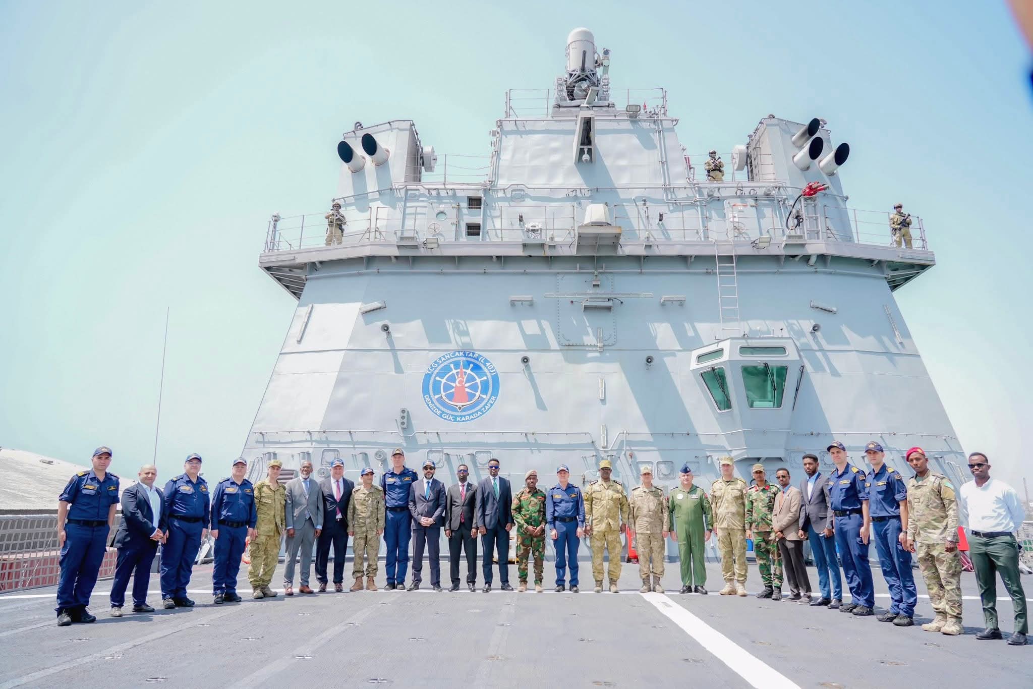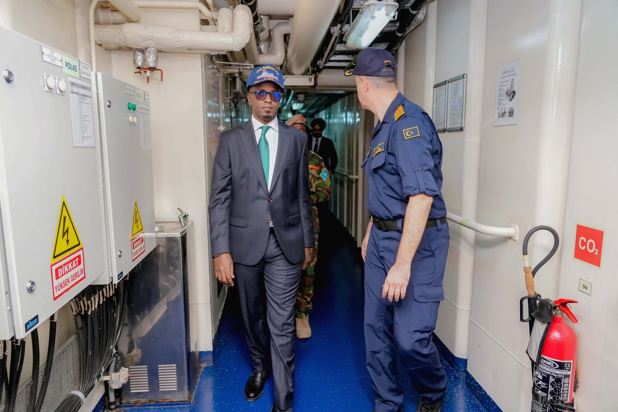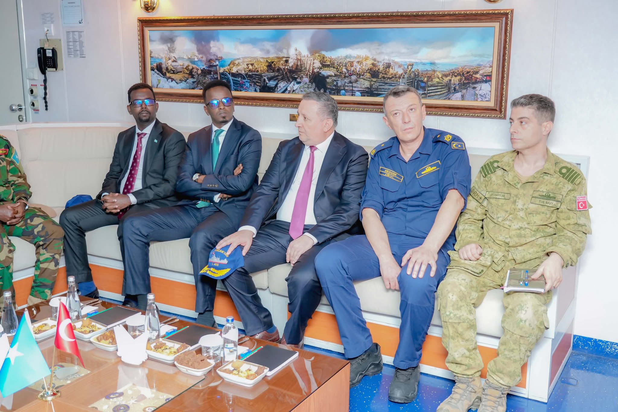 Muqdisho(Wargeyska Dalka):-Wasiir Dowlaha Wasaarada Gaashandhigga XJFS Cumar Cabdi Cali uu wehliyo Taliyaha Ciidanka Xoogga Dalka Sarreeye Guuto Ibraahim Maxamed Maxamuud ayaa Magaalada Muqdisho kusoo dhaweeyay Maraakiib Dagaal oo ay leeyihiin Ciidanka Badda ee Dowladda Turkiga.