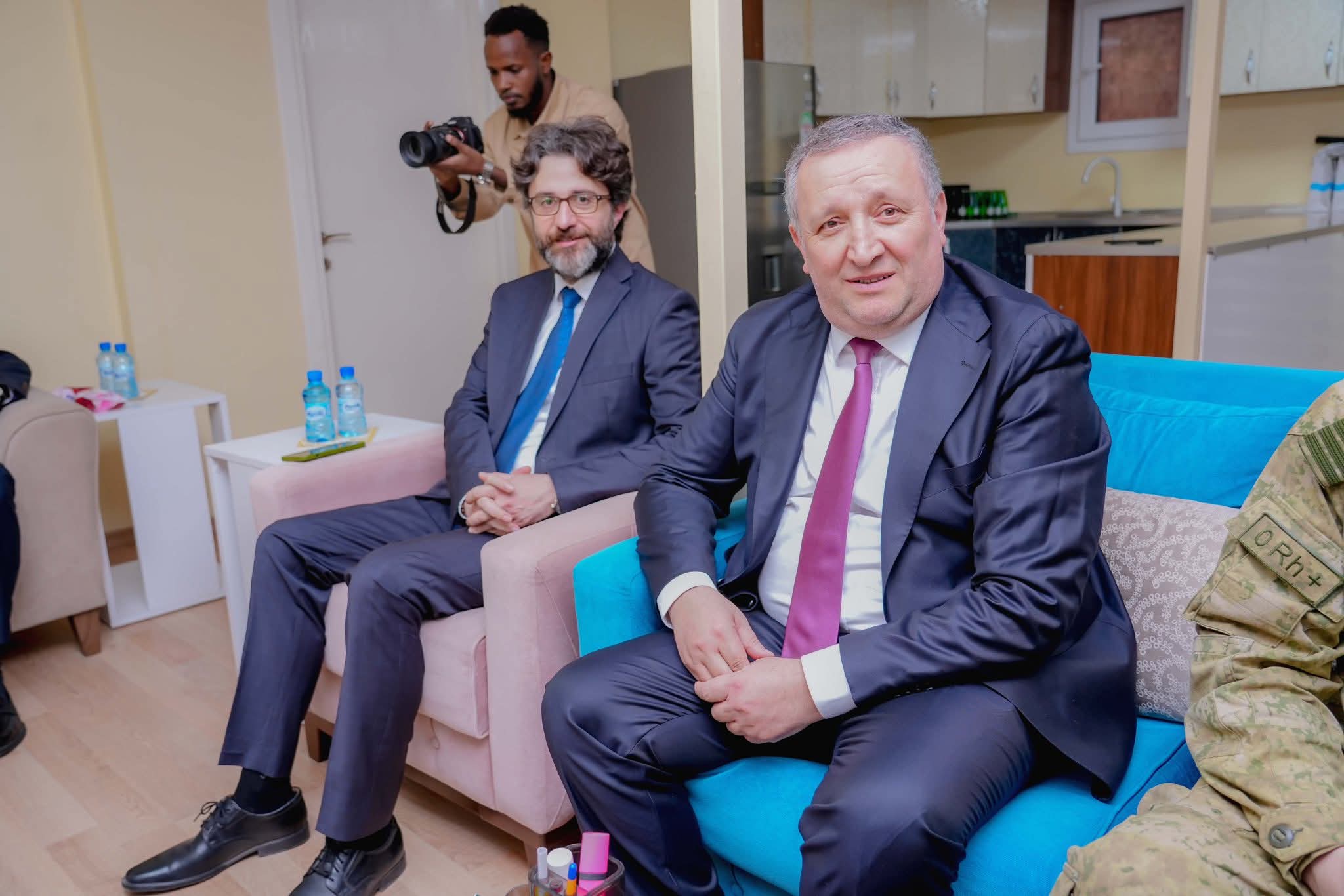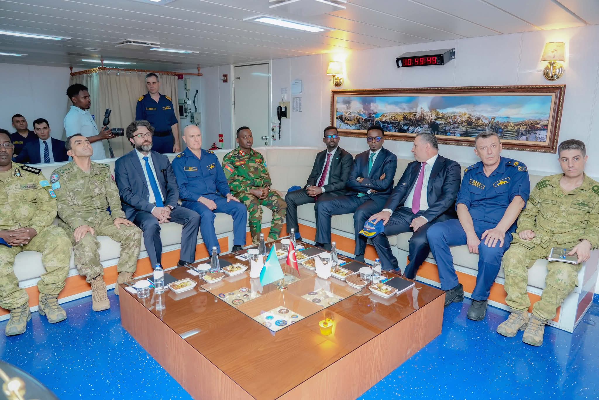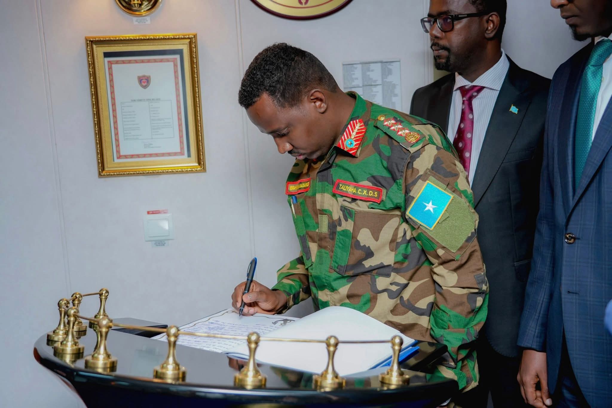 Muqdisho(Wargeyska Dalka):-Wasiir Dowlaha Wasaarada Gaashandhigga XJFS Cumar Cabdi Cali uu wehliyo Taliyaha Ciidanka Xoogga Dalka Sarreeye Guuto Ibraahim Maxamed Maxamuud ayaa Magaalada Muqdisho kusoo dhaweeyay Maraakiib Dagaal oo ay leeyihiin Ciidanka Badda ee Dowladda Turkiga.