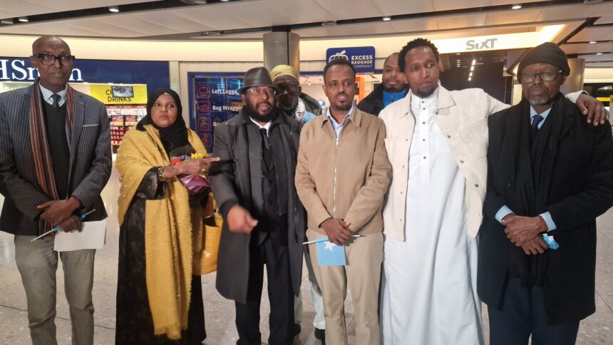 Wafdiga ayaa garoonka diyaaraha Heathrow Airport waxaa ku soo dhaweeyey xubno ka tirsan Jaaliyadda Soomaaliyeed ee UK, Wariyaal iyo qeybaha kala duwan ee bulshada Soomaaliyeed.