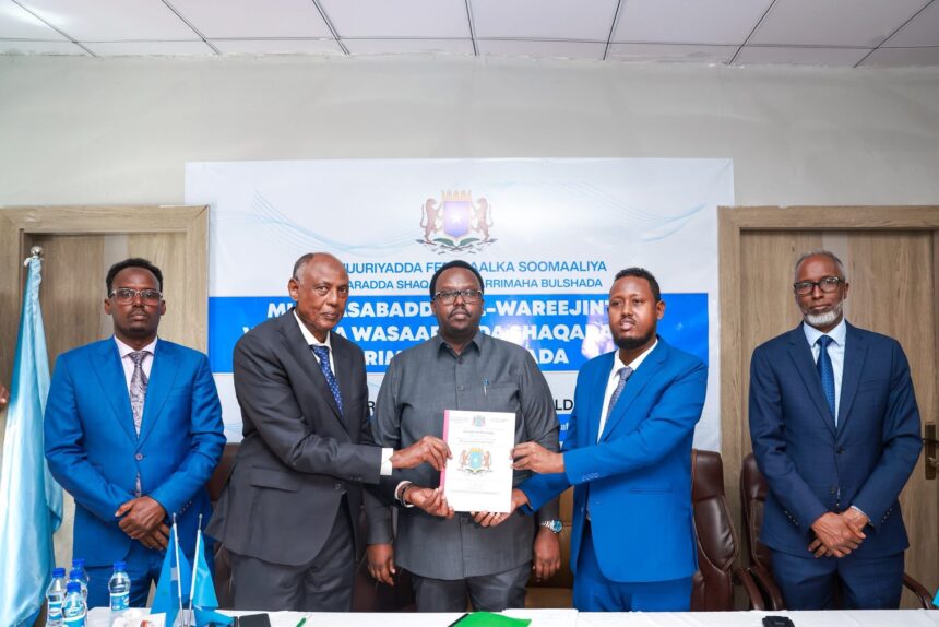 Ra’iisul Wasaare ku xigeenka Xukuumadda Jamhuuriyadda Federaalka Soomaaliya Mudane Saalax Axmed Jaamac ayaa xilka u kala wareejiyey Wasiirka cusub ee Wasaaradda Shaqada iyo arrimaha bulshada Mudane Saalim Caliyow Ibrow iyo Wasiirkii hore Mudane Yuusuf Maxamed Aaden.