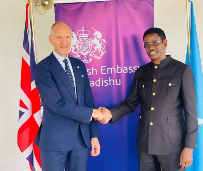Wasiirka Amniga Gudaha ee Xukuumadda Federaalka Soomaaliya, Mudane Cabdullaahi Sheekh Ismaaciil (Fartaag) oo la kulmay Danjiraha Dowladda Ingiriiska u fadhiya Soomaaliya Mudane Mike Nithavrianakis, ayaa kala hadlay xoojinta taageerada ay UK siiso hey’adaha amniga Soomaaliya.
