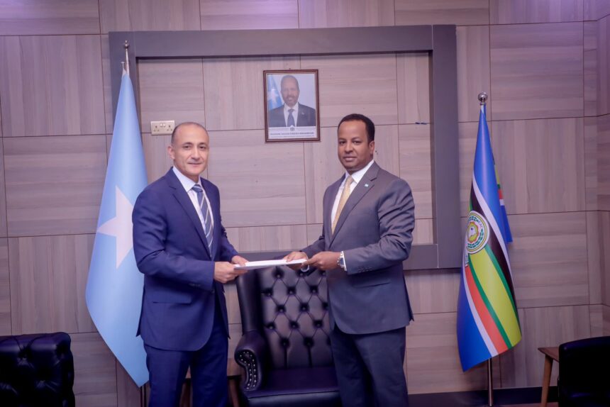 Muqdisho-(Wargeyska Dalka)-Wasiirka Arrimaha Dibadda iyo Iskaashiga Caalamiga, Mudane Cabdisalan Cabdi Cali, ayaa maanta xafiiskiisa kaga guddoomay nuqul ka mid ah warqadaha aqoonsiga danjirennimo, Safiirka cusub ee Jamhuuriyadda Masar, Mudane Mohamed Salah Hassan Keshtah.