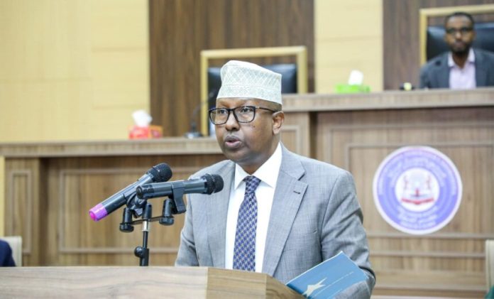 Wasiirka Wasaaradda Arrimaha Gudaha, Federaalka iyo Dib-u-heshiisiinta XFS Mudane Axmed Macallin Fiqi ayaa Xildhibaannada Aqalka Sare ka hor akhriyay Hinside sharciyeedka Qaxootiga iyo Magangalyo Doonka ee 2023, Akhrintiisa 1-aad.