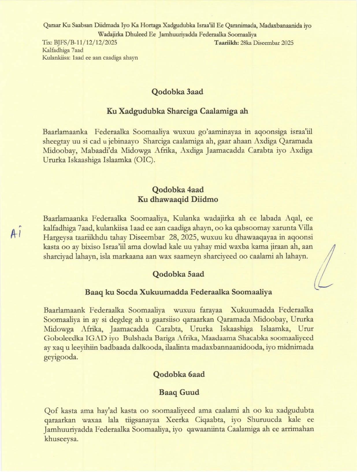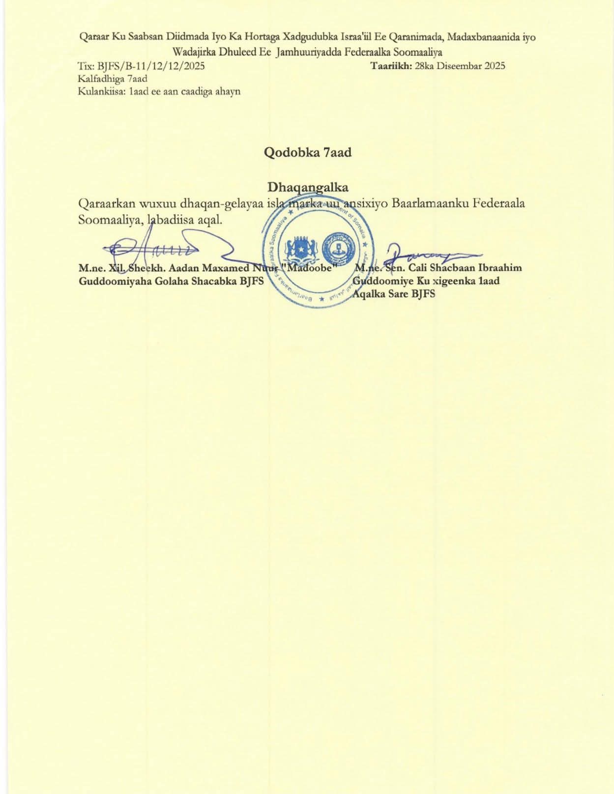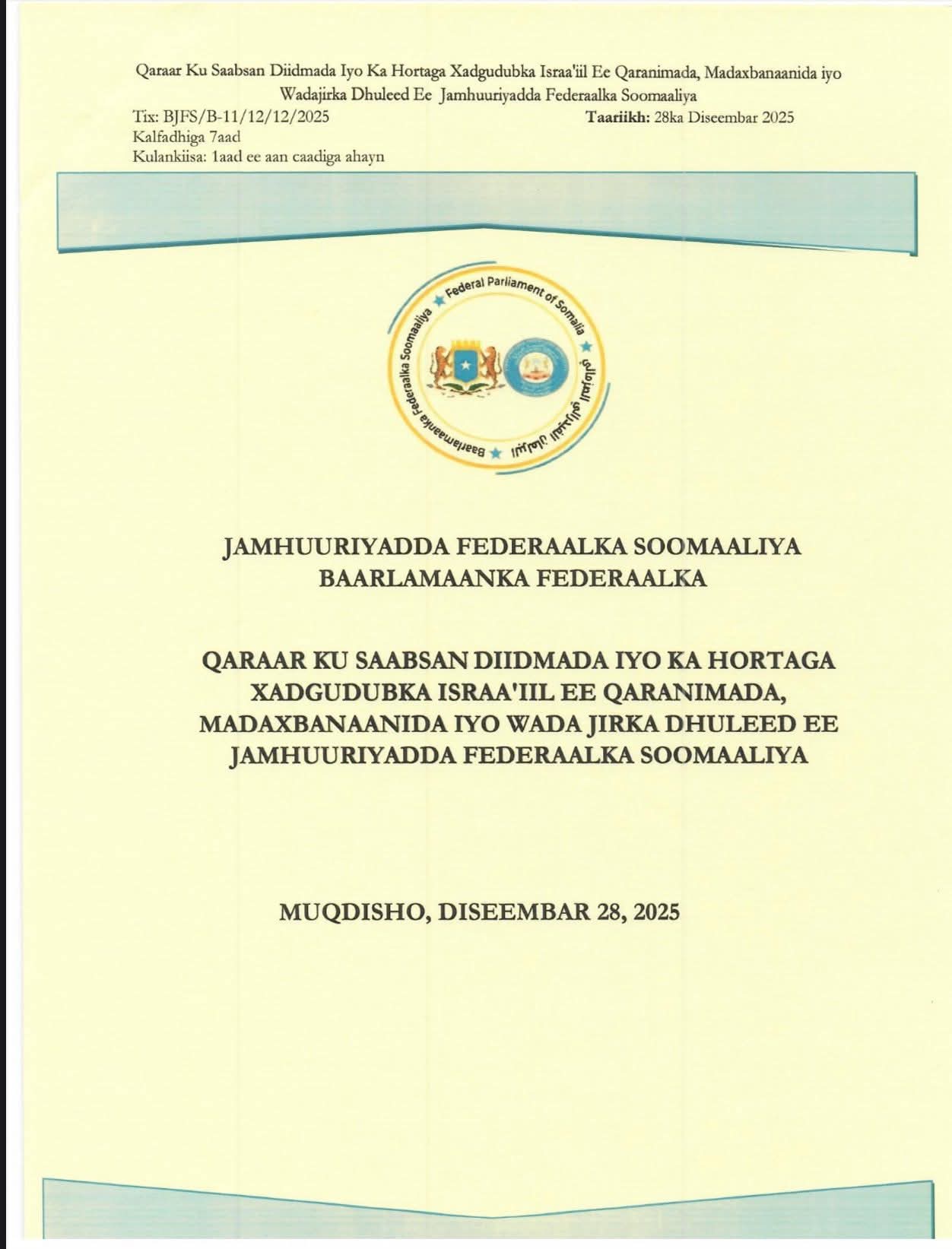 Muqdisho(Wargeyska Dalka);Mudanayaasha labada Aqal ee Baarlamaanka Jamhuuriyadda Federaalka Soomaaliya, oo maanta kulan aan caadi ahayn ku yeeshay xarunta Villa Hargeisa, ayaa cod aqlabiyad ah ku ansixiyey qaraar ku saabsan diidmada iyo ka-hortagga xadgudubka Israa’iil ee Madaxbannaanida Dhuleed ee Jamhuuriyadda Federaalka Soomaaliya.