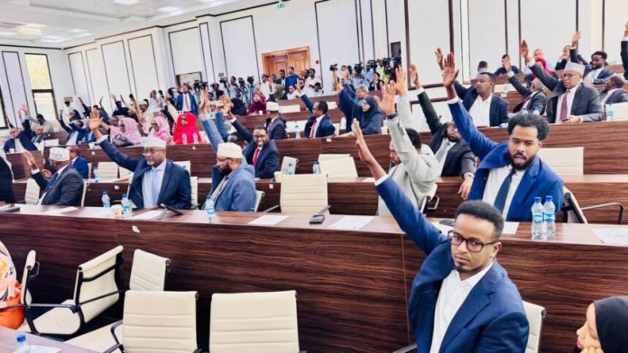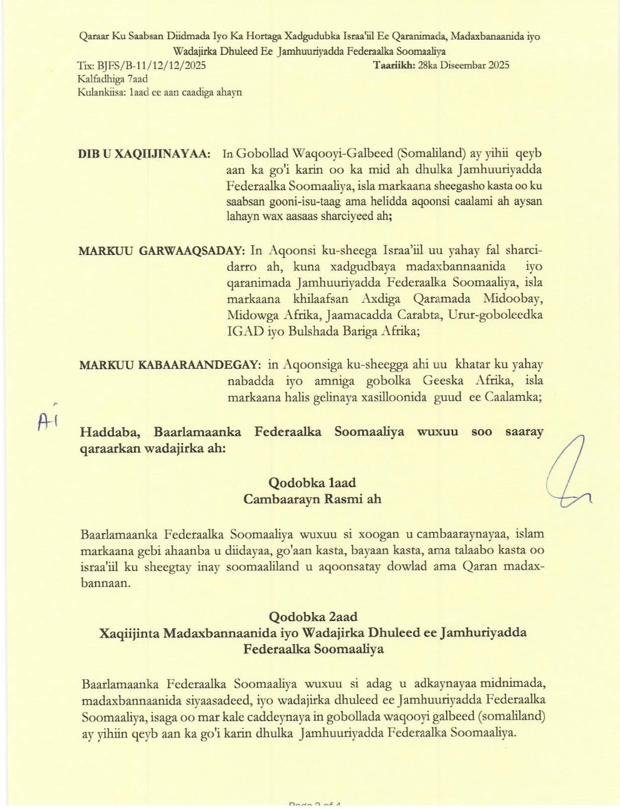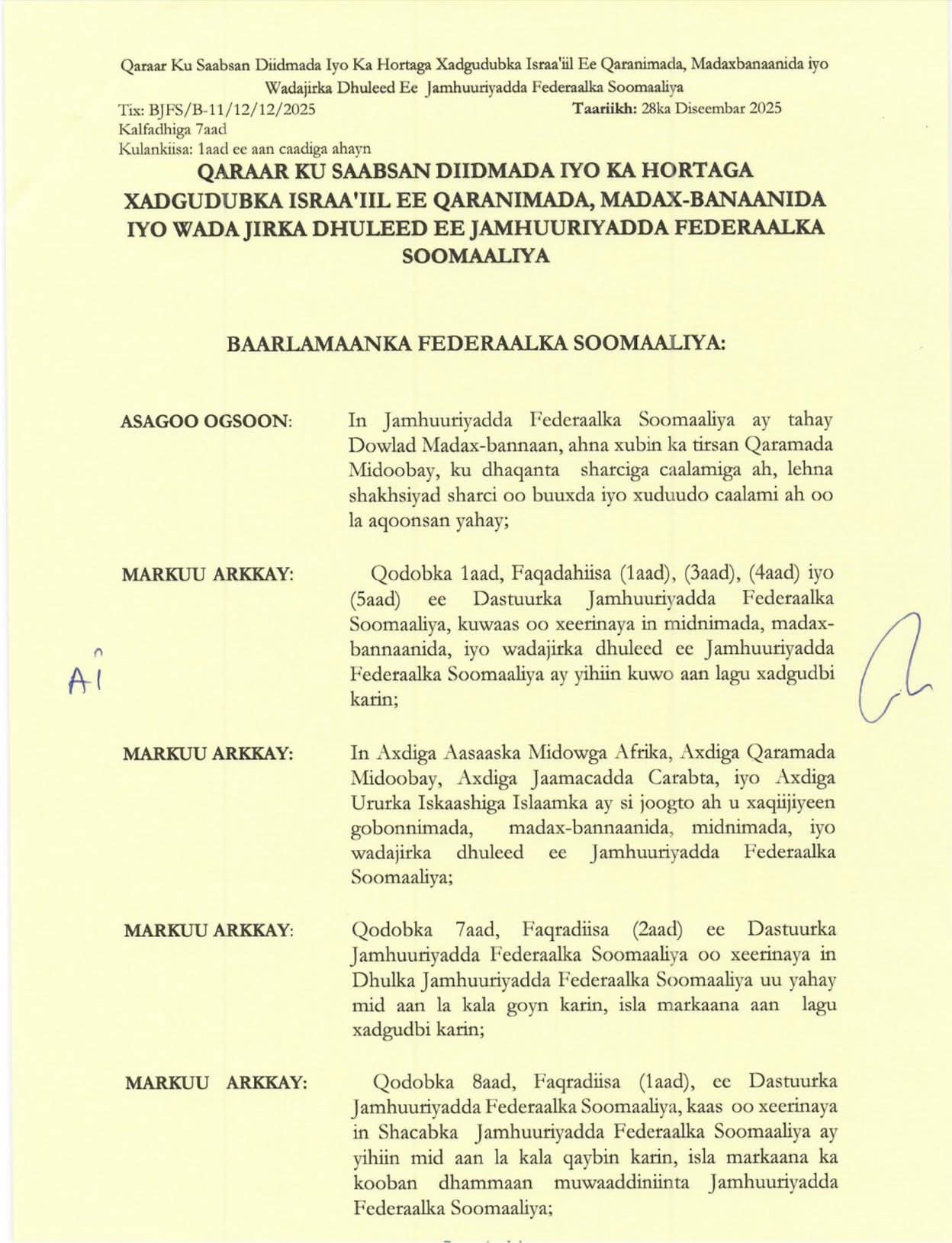 Muqdisho(Wargeyska Dalka);Mudanayaasha labada Aqal ee Baarlamaanka Jamhuuriyadda Federaalka Soomaaliya, oo maanta kulan aan caadi ahayn ku yeeshay xarunta Villa Hargeisa, ayaa cod aqlabiyad ah ku ansixiyey qaraar ku saabsan diidmada iyo ka-hortagga xadgudubka Israa’iil ee Madaxbannaanida Dhuleed ee Jamhuuriyadda Federaalka Soomaaliya.