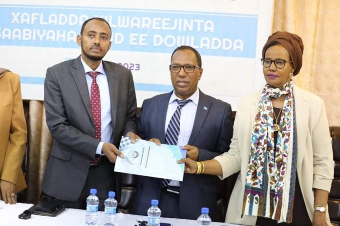Dr Raaxo Jinaqoow wasiiru dowlaha wasaaradda maaliyadda Soomaaliya, wasiir ku xigeenka wasaarassa qorsheynta Maxamed Cabduqaadir Cali iyo Guddoomiyaha Bangiga dhexe Cabdiraxmaan Maxamed Cabdullaahi ayaa soo dhoweeyey xisaabiyaha cusub, iyaga bogaadiyey xisaabiyihii hore shaqadii ay u qabatay Qaranka muddadii ay xilka haysay.